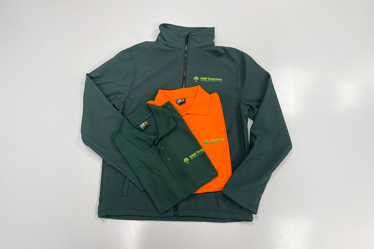 A mixture of green and bright orange garments were printed using hardwearing transfers to show off the company logo.